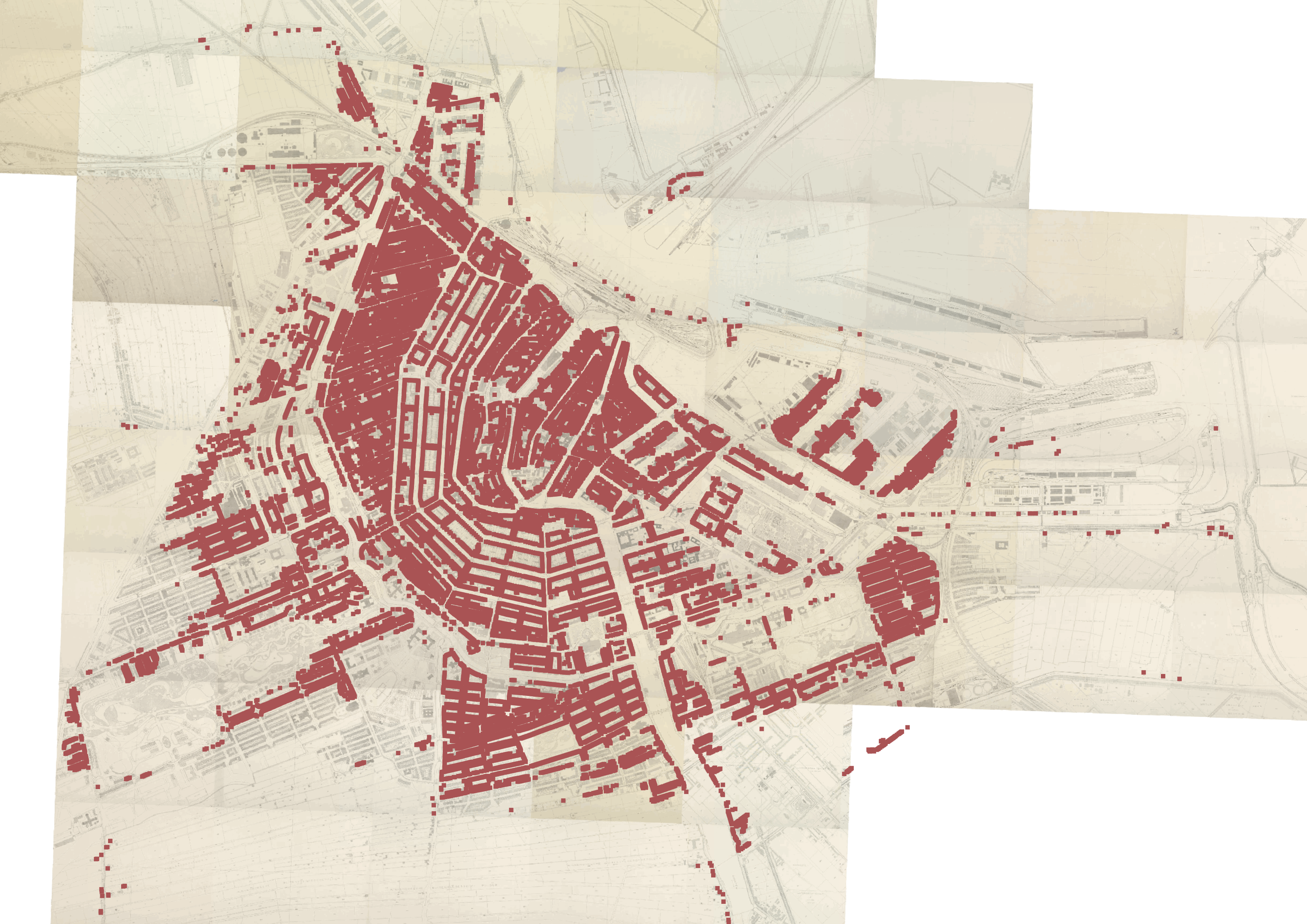 Het was ook een zeer omvangrijke klus, waar veel van onze vrijwilligers ontzettend hard aan hebben gewerkt. Al die 1.107 woningboeken zijn doorgespit, met elk meer dan 150 bladen. Ons belangrijkste doel was om de bevolkingsdichtheid in het beginjaar van de woningboeken te bepalen (1897). En dat is gelukt! Op de onderstaande kaart is te zien waar de 113.582 in de woningboeken genoemde adressen uit 1897 zich bevonden in de stad. Voor elk rood blokje weten we hoeveel mannen en vrouwen op dat adres woonden. Deze informatie kunnen we direct gebruiken in ons onderzoek naar tuberculose in de stad, aangezien we vermoeden dat bevolkingsdichtheid daar een belangrijke determinant in was.