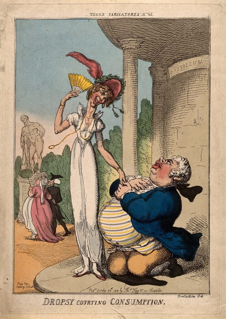 De connectie van TBC met schoonheid leidde tot een groot aantal afbeeldingen waarin de ziekte werd geïdealiseerd, geromantiseerd of door middel van karikaturen werd becommentarieerd door tijdgenoten. Een voorbeeld van dat laatste is de ets uit 1810 getiteld ‘Dropsy courting consumption’ van T. Rowlandson, zie hieronder. De zeer dikke man in deze cartoon representeert ‘dropsy’, de engelse term voor waterzucht; tegenwoordig zouden we zeggen oedeem. Deze dikke man maakt de lange en dunne TBC-patiënte het hof: zij bepaalt nu de mode van de dag. We zien ook in de achtergrond een paar uit het beeld wandelen: zij representeren eveneens de vertrekkende mode. Let op de kleding van de vrouw, waarmee een gezwollen lichaam wordt gesuggereerd. Tot dat moment gold een gezwollen lichaam als een teken van overvloed en welstand, maar die tijd is voorbij.