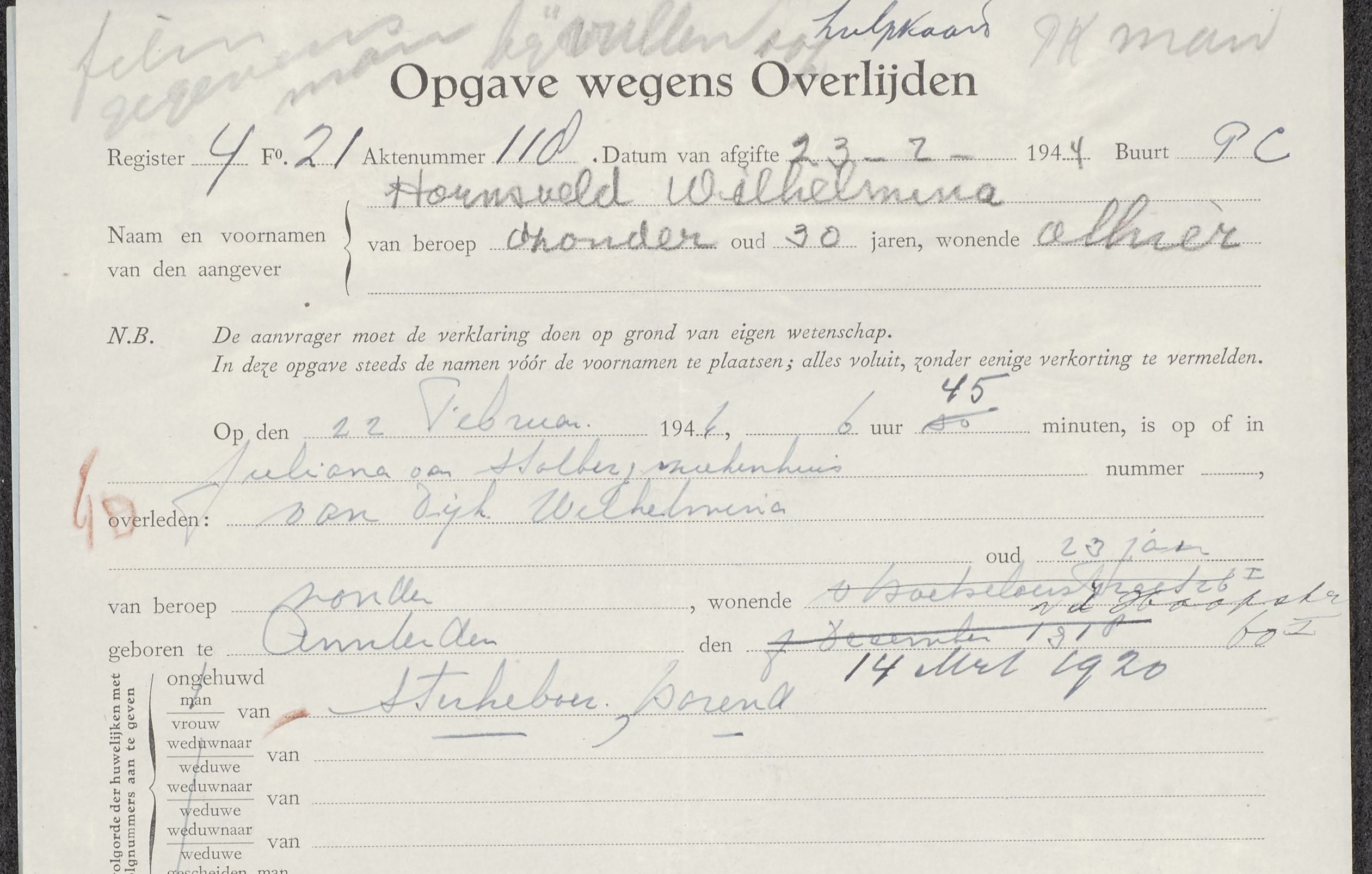 Betreft overledene: Wilhelmina van Dijk, Amsterdam, 1944}