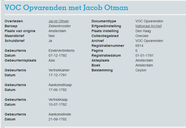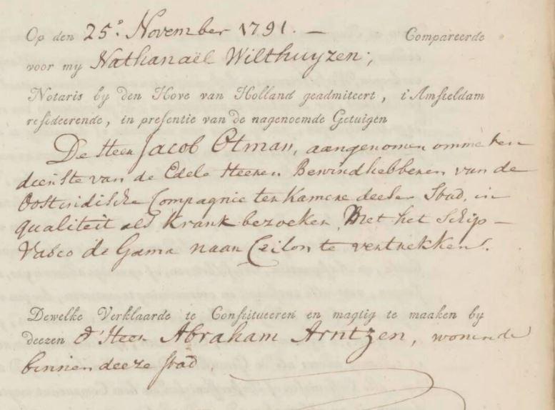 Cornelia Catharina gedoopt 3-1-1781, overleden 19-1-1849Jacob Otman, krankbezoeker/ziekentrooster bij de VOC, machtigde Abraham Arntzen op 25-11-1791 om al zijn zaken te regelen, vertrok op 7-12-1791 uit Amsterdam, kwam op 21-9-1792 aan in Ceylon en overleed op 7-12-1792.