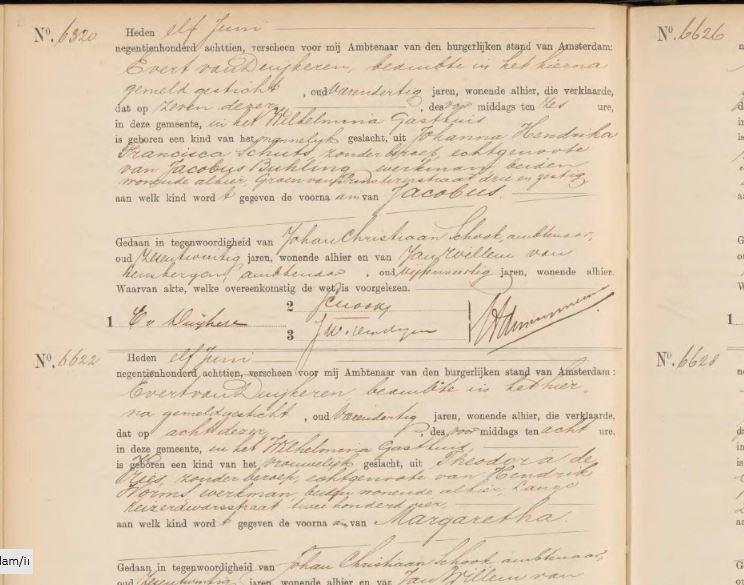 DeelnemerNog meer gevonden op de website van het Stadsarchief Amsterdam. Weer terug naar toegangsnr.5009, geboorteaktes in 1918, betr.} inv.7863, deelnr.12. Zie scanp.30/103, dan leest men 2x geboorteakte Nº.6298, ook allebei geboorteaktedatum drie Juni 1918, bladnummer 28v. en bladnr.29. / Deze geboorteaktes zijn niet met dezelfde inhoud, zie verder} https://archief.amsterdam/inventarissen/scans/5009/1.3.26.12/start/20/limit/10/highlight/10