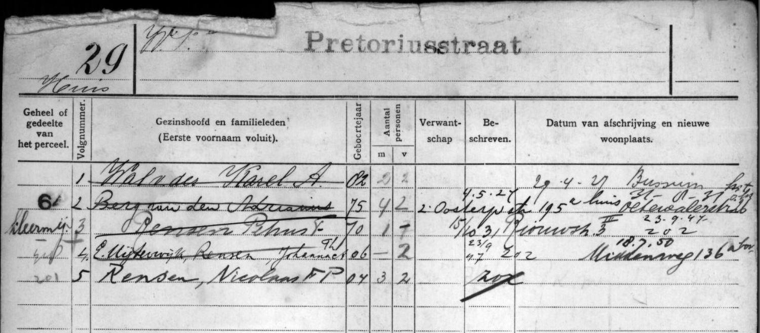 ModeratorVolgnr 1 is verhuisd in 1927, nr 2 in 1931. Dus het hoofd van het daar wonende gezin in 1945 is Petrus F Rensen. Die was coupeur en had een kleermakerij.