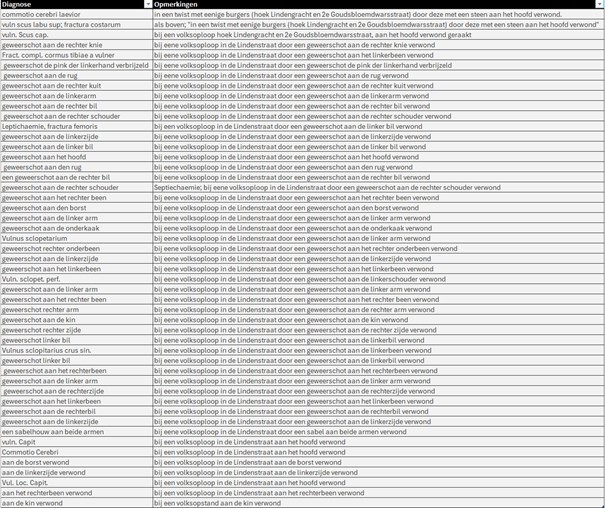 De patiënten kwamen over het algemeen op de zogeheten ‘verbandafdeling’ (chirurgische afdeling) terecht van het ziekenhuis. Op deze afdeling werden vaak patiënten geholpen met bijvoorbeeld botbreuken, verbrijzelingen, (brand)wonden, (interne) bloedingen, ontstekingen en hersenschuddingen. In onderstaande tabel zien we de ‘diagnose’ waarmee de patiënten die betrokken waren bij de volksopstand werden opgenomen. Het overgrote deel betrof letsel ten gevolge van geweerschoten, zij kwamen vaak na de tweede dag van het Palingoproer in het ziekenhuis binnen. Van alle opgenomen patiënten – vijftig in totaal – overleden er tien in het ziekenhuis aan de gevolgen van hun verwondingen. We kunnen dus vaststellen dat het Binnengasthuis een belangrijke rol speelde bij de opvang en verzorging van de gewonden na deze volksoproer.