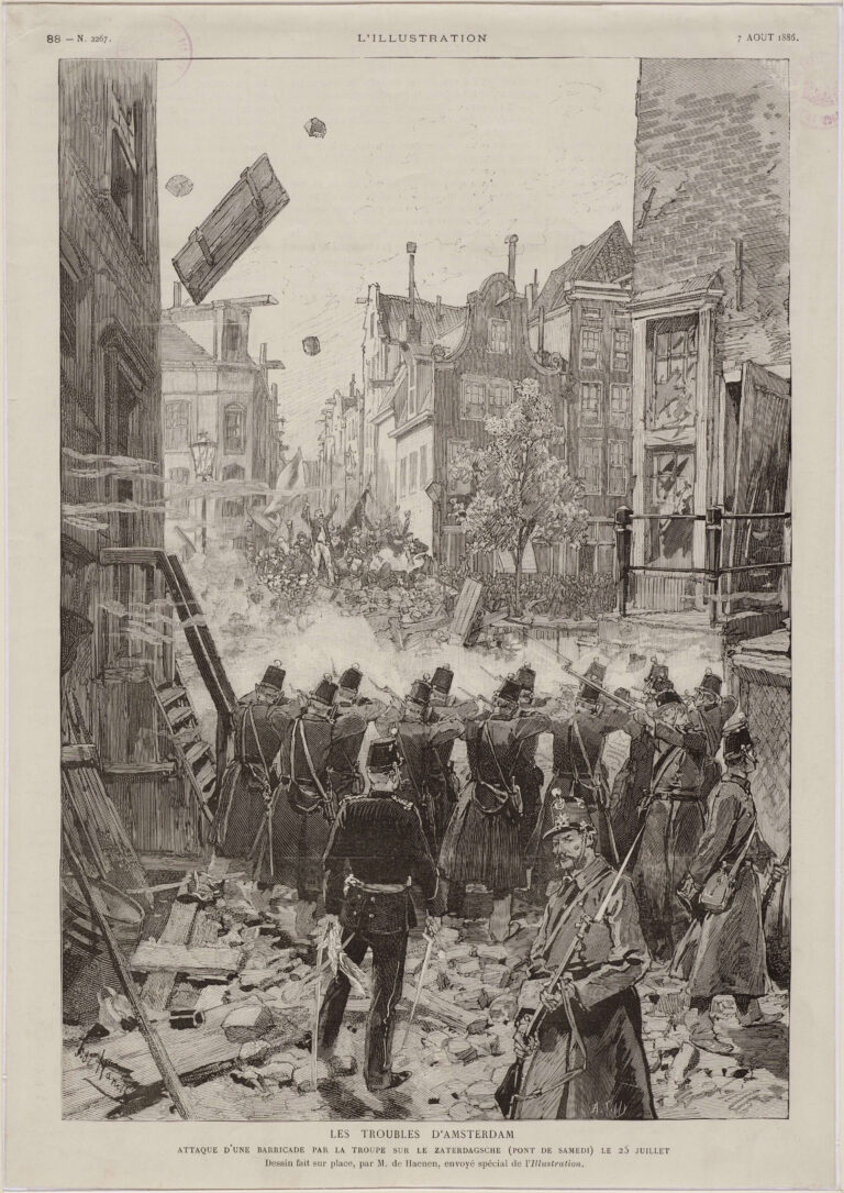 Op zondag 25 juli 1886 trok een groot publiek naar de Zaterdagse Brug (over de Lindengracht) voor een spelletje palingtrekken. De sfeer sloeg om toen de politie ingreep en het touw waaraan de levende paling hing doorsneed. De toeschouwers keerden zich hierop tegen de agenten. Naar verluidt zou een van de agenten van de politie een kelder in zijn getrokken en daar mishandeld. De andere agenten trokken hun sabels en vochten zich een weg door de woedende menigte om versterking te halen. Ze werden bekogeld met stenen. Sommige van hen raakten dusdanig gewond dat ze behandeld moesten worden in het Binnengasthuis, waarover later meer. De volgende dag (26 juli) braken er opnieuw rellen uit. Een gewapende menigte trok naar het politiebureau aan de Noordermarkt. De agenten werden in het nauw gedreven en riepen versterking in, en later zelfs het leger. Wat volgde was een hevig gevecht: straten werden opgebroken, barricades opgeworpen en er ontstonden felle confrontaties tussen de woedende menigte, de politie en het leger.