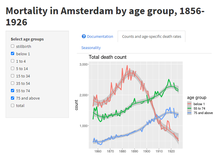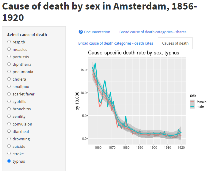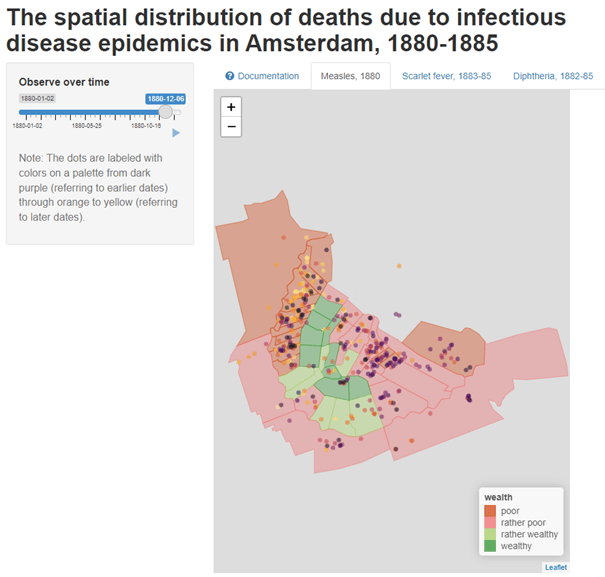 Het afgelopen jaar zijn er vijf van deze interactieve webapplicaties op de website verschenen. Ze waren meestal voorzien van een korte aankondiging, maar het nut en doel van deze visualisaties hebben we nog nergens uitvoerig besproken. Toch zijn de thema’s waarop de webapplicaties een ingang bieden zeker niet de minste. Sterker nog, als je weet waar je naar kijkt vertellen ze het verhaal van één van de belangrijkste veranderingen van de afgelopen tweehonderd jaar: namelijk over de demografische transitie. Met dit proces wordt de overgang van een hoog sterfte- en geboortecijfer naar een laag sterfte- en geboortecijfer aangeduid. De veranderingen in de sterftepatronen – vooral vanaf de jaren 1870 – vormen de kern van ons onderzoeksproject. Via de webapplicaties kan iedereen deze omslag zelf bevragen op aspecten als sekse, leeftijdsgroep en seizoen, ruimtelijke verdeling en specifieke doodsoorzaken. Uitgangspunt is namelijk dat niet iedereen in gelijke mate op hetzelfde moment kon delen in de vooruitgang. Zo toont deze applicatie bijvoorbeeld hoe het sterfte steeds minder gedomineerd werd door het overlijden van zuigelingen, en illustreert deze andere app hoe de afname van het sterftecijfer aan tuberculose eerder inzette voor vrouwen dan voor mannen. Weer een andere app laat zien hoe de bewoners van de welgestelde Amsterdamse grachtengordel de grote uitbraken van mazelen, roodvonk en difterie tussen 1880 en 1885 keer op keer lijken te hebben ontweken.