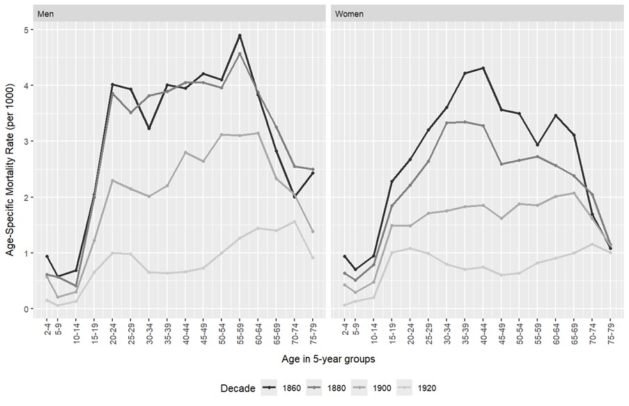 De onderstaande twee grafieken geven de sterftecijfers voor longtuberculose per geslacht weer. Deze grafieken zijn gespecificeerd naar leeftijd, waarbij elke lijn een andere periode weergeeft. In algemene zin zien we hier de eerdergenoemde sterftedaling voor zowel mannen als vrouwen: rond 1900, en zeker daarna, sterven aanzienlijk minder mensen aan longtuberculose.