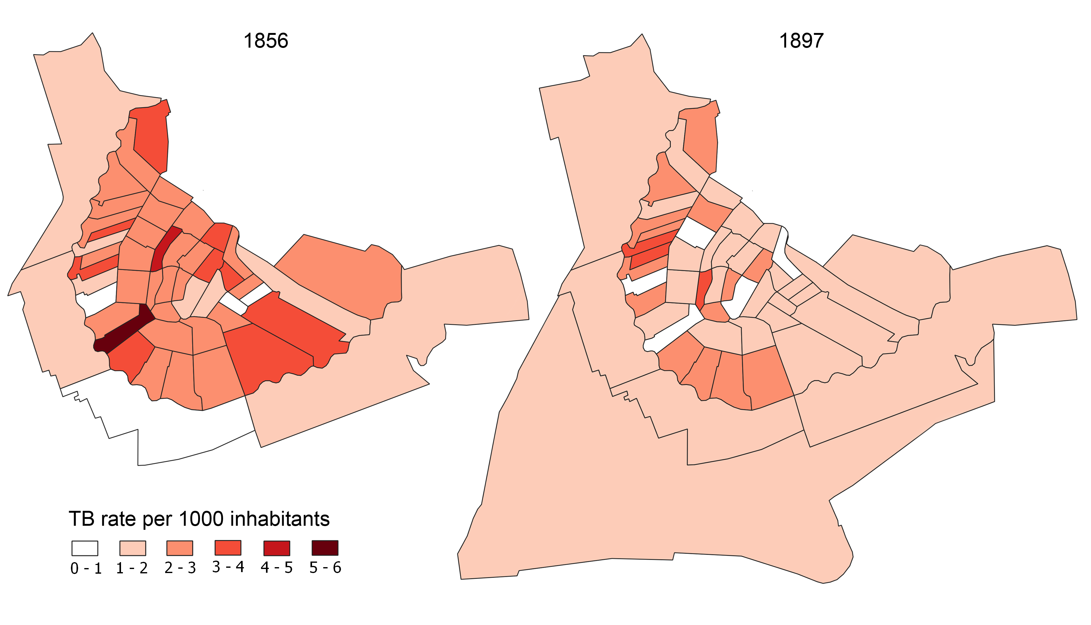 Het in kaart brengen van veranderingen in het sterftepatroon roept natuurlijk allerlei vragen op over mogelijke onderliggende oorzaken. De afname van sterfte aan tuberculose gedurende de tweede helft van de negentiende eeuw is op zichzelf al vrij bijzonder te noemen, aangezien de tuberculosebestrijding in bijvoorbeeld sanatoria pas na de eeuwwisseling echt op gang kwam. Geneesmiddelen lieten nog tot na de Tweede Wereldoorlog op zich wachten. De vooruitgang die voor die tijd werd geboekt, zal dus hoogstwaarschijnlijk aan andere factoren moeten worden gewijd, zoals verlaging van de bevolkingsdichtheid en verbeteringen in levensstandaard en voeding. Door te kijken naar verschillen binnen de stad en naar de eigenschappen van die gebieden, proberen we de sociale, economische en omgevingsinvloeden op het voorkomen en het uiteindelijke verdwijnen van deze volksziekte nummer één beter te gaan begrijpen.