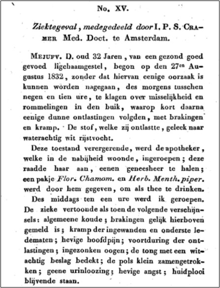 Cholera is een infectieziekte die wordt veroorzaakt door de bacterie Vibrio Cholerae. Tegenwoordig is cholera in Nederland zeer zeldzaam, maar in de negentiende eeuw was het een belangrijke en veelvoorkomende ziekte. De mensen die in het verleden met de cholerabacterie in aanraking kwamen werden vaak ernstig ziek. Belangrijke symptomen waren braken, diarree en (extreme) uitdrogingsverschijnselen. Voor de ‘cholera-lijders’ waren de vooruitzichten slecht: meer dan de helft overleed, meestal binnen een paar dagen, maar soms zelfs binnen enkele uren. Lange tijd tastten medici in het duister wat betreft de snelle verspreiding en exacte oorzaken van de ziekte. De Engelse geneesheer John Snow ontdekte uiteindelijk in 1854 (na een grote uitbraak van cholera in Londen) de belangrijke rol van verontreinigd (drink)water. Toch duurde het nog tot het einde van de negentiende eeuw voordat zijn bevindingen breed werden erkend en er maatregelen werden genomen.