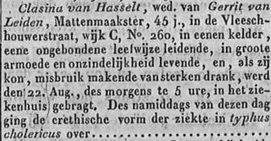 Ook in Nijmegen kwamen er in de negentiende eeuw herhaaldelijk epidemieën van de cholera voor. Tijdens een grote uitbraak in 1832 weden 42 mensen ziek: 19 van hen overleden, 23 mensen herstelden. Stadsgeneesheer Cornelis van Eldik legde deze uitbraak uitvoerig vast in zijn boek over de Aziatische braakloop (cholera) te Nijmegen. Hij beschreef nauwkeurig wie er ziek werden, waar ze woonden en hoe ze ziek werden. Eén van die gevallen was Clasina van Hasselt, een 45-jarige weduwe en mattenmaakster die in een kelderwoning aan de Vleeschhouwerstraat woonde. Over haar schreef Van Eldik: “eene ongebondene leefwijze levende, en, als zij kon, misbruik makende van sterkendrank, werd den 22. Aug., des morgens te 5 ure, in het ziekenhuis gebragt. Des namiddags van dezen dag ging der erethische vorm der ziekte in typhus cholericus over”. Dit laat zien hoe cholera vooral slachtoffers maakte onder mensen in slechte woonomstandigheden. Armoede, een gebrek aan hygiëne en overbevolkte huizen vergrootten de kwestbaarheid voor deze dodelijke ziekte.
