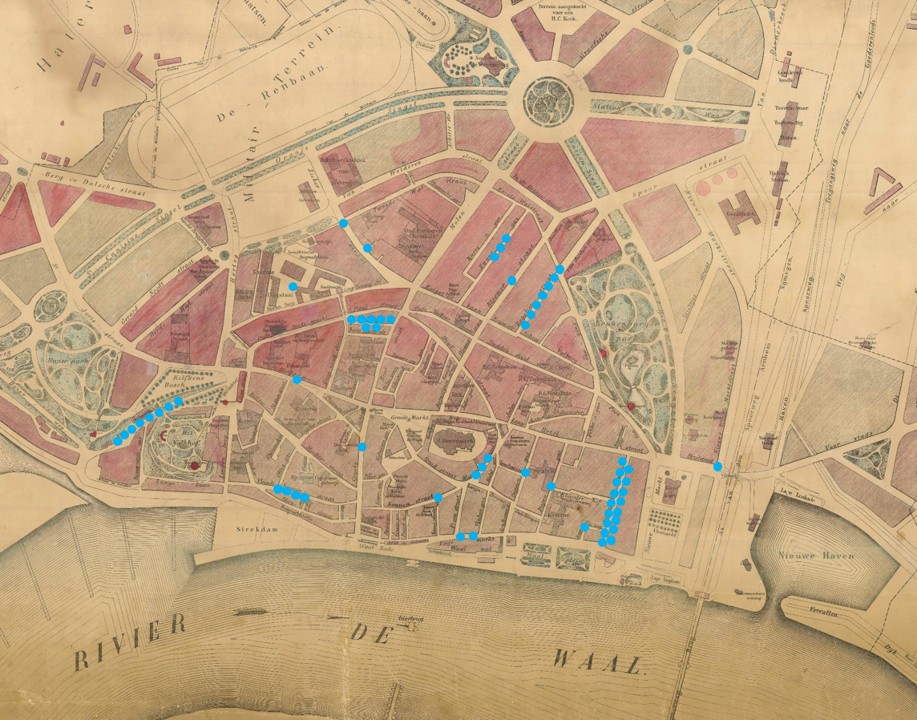 De laatste grote cholera-uitbraak in Nijmegen vond plaats in 1866. Daarbij vielen 67 doden. Op de kaart hieronder zijn alle sterfgevallen uit dat jaar per straat weergegeven: elk blauw bolletje staat voor één sterfgeval ten gevolge van cholera. Hier is eveneens te zien dat de meest verpauperde stadsdelen – zoals rondom de Bottelstraat en Voerweg – onevenredig hard werden getroffen.