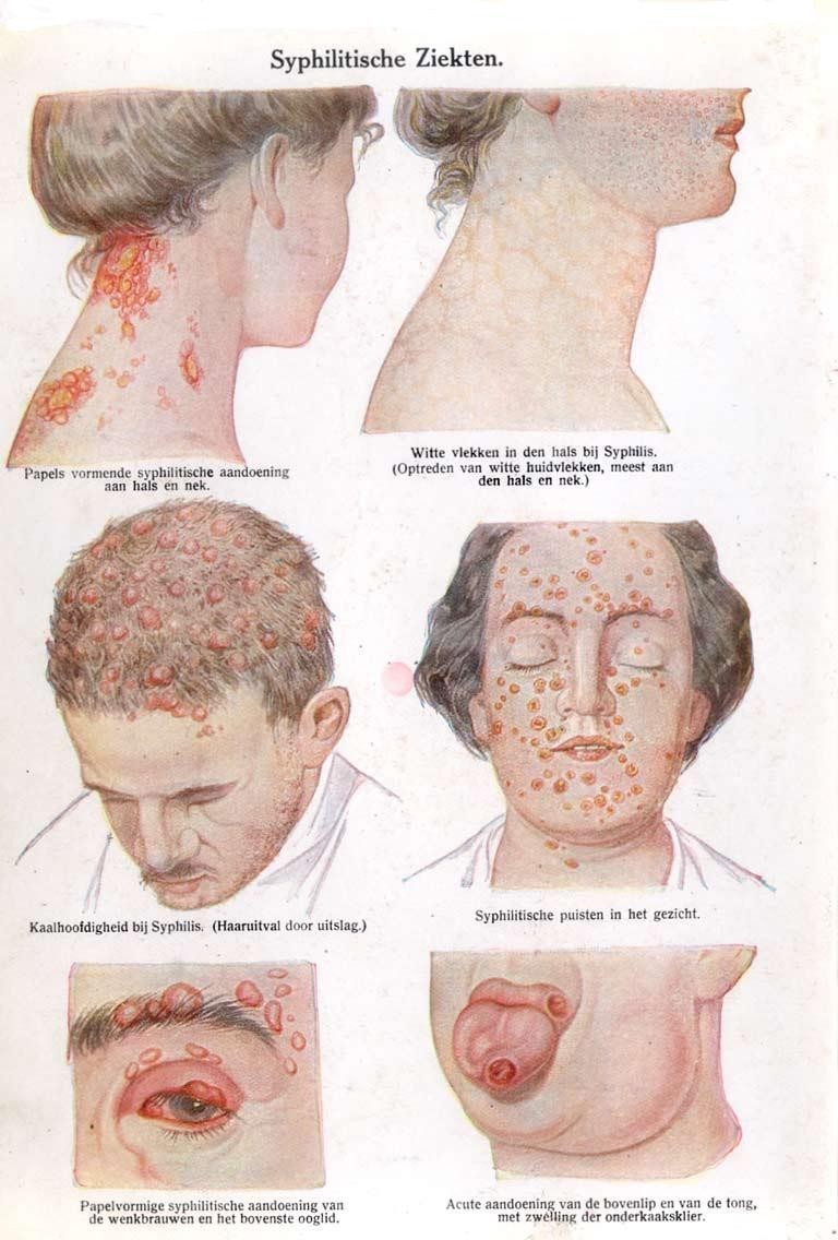 De verschillende uitingsvormen van syfilis (bron: Friedrich Eduard Bilz, 'De nieuwe natuurgeneeswijze' 1923)