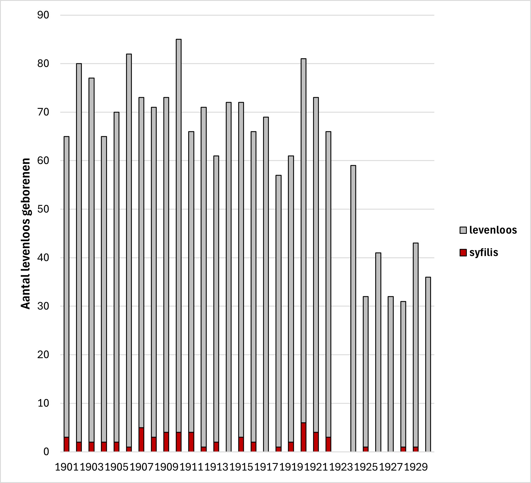 In het begin van de twintigste eeuw werden in Nijmegen jaarlijks tientallen kinderen levenloos geboren. Een deel van deze sterfgevallen werd veroorzaakt door een geslachtsziekte: syfilis. De ziekte werd in deze gevallen via de vader of moeder worden overgedragen op het ongeboren kind. De rode segmenten in de grafiek tonen het aantal doodgeboren kinderen waarbij syfilis een rol speelde.