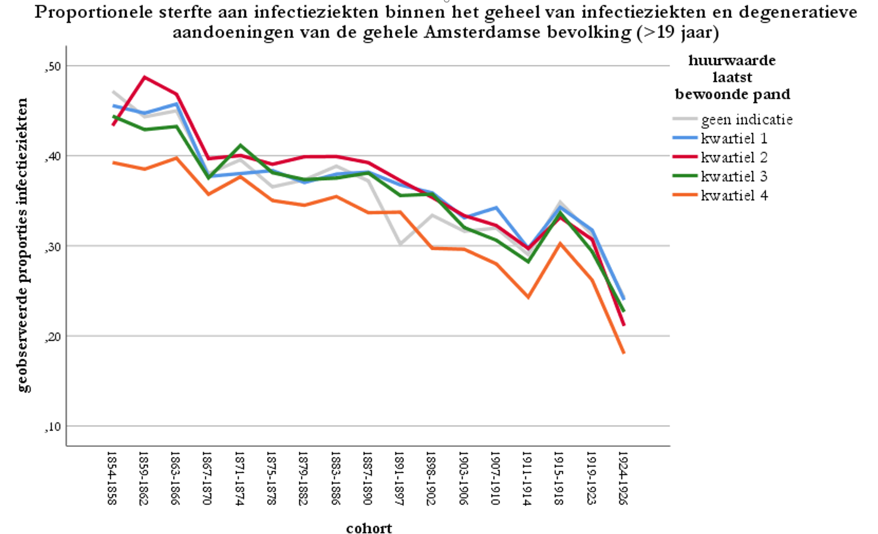 Met het uitvoeren van een complexe statische analyse (multinomiale logistische regressie) proberen we te achterhalen of er onder Amsterdammers van twintig jaar en ouder sociaal-economische verschillen in doodsoorzaken bestonden. Op die manier is figuur 1 tot stand gekomen. In de figuur is de proportionele sterfte aan infectieziekten binnen het geheel van infectieziekten en degeneratieve aandoeningen naar sociaal-economische groep (kwartiel) opgenomen. De resultaten in de figuur laten een eenduidig beeld zien: onder Amsterdammers uit de hoogste sociaal-economische groep was er gedurende de gehele onderzoeksperiode minder proportionele sterfte aan infectieziekten, dan onder andere sociaal-economische groepen. De allerrijksten hadden daarmee een grotere kans om gestorven te zijn aan een degeneratieve aandoening. Voor de Amsterdammers die in één van de andere drie sociaal-economische groepen verkeerden, bestonden er nauwelijks verschillen, waarbij de proportionele sterfte aan infectieziekten onder personen met een pand waarvan de huurwaarde in het tweede kwartiel viel op enkele momenten (1854-1871 en 1875-1891) het hoogste was. Bovendien zijn in de figuur ook de gevolgen van de verschillende epidemieën van infectieziekten terug te zien: de cholera (1859 en 1866), pokken (1871), difterie (1883-1884), roodvonk (1884-1885), mazelen (1890-1891) en Spaanse griep (1918). Het lijkt erop dat alle Amsterdammers, ongeacht sociaal-economische status, door deze epidemieën werden getroffen, maar tegelijkertijd dat ook juist tijdens deze jaren de eerder benoemde sociaal-economische verschillen in doodsoorzaken aanwezig waren. Hiermee lijkt de fundamental causes theory op te gaan voor de Amsterdamse bevolking van twintig jaar en ouder.